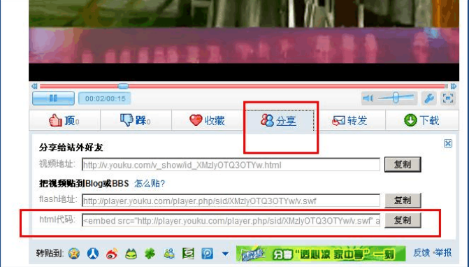 1. 點擊視頻下的分享按鈕,在顯示的鏈接代碼中選擇html代碼,點擊復制按鈕