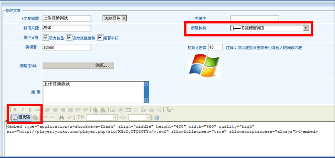 2.點擊文本編輯框的源代碼,切換到源代碼編輯狀態,把在視頻網上復制的html代碼粘貼到框內(見下圖圖1),再點擊源代碼按鈕,切換到文本編輯狀態,這時你會看到有一個flash框(見下圖),證明已經添加上去,最后點擊保存按鈕,即完成了視頻的添加