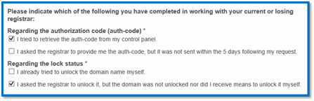 3、Please indicate which of the following you have completed in working with your current or losing registrar: 請說明當前域名轉移處理情況,這里分兩個部分選擇相應問題說明