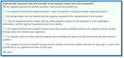 注冊商拒絕轉移,因為我沒有支付轉移費用。 (如果原注冊商要求收取轉移費用或必須續費一年才給轉,就選擇上這一項)